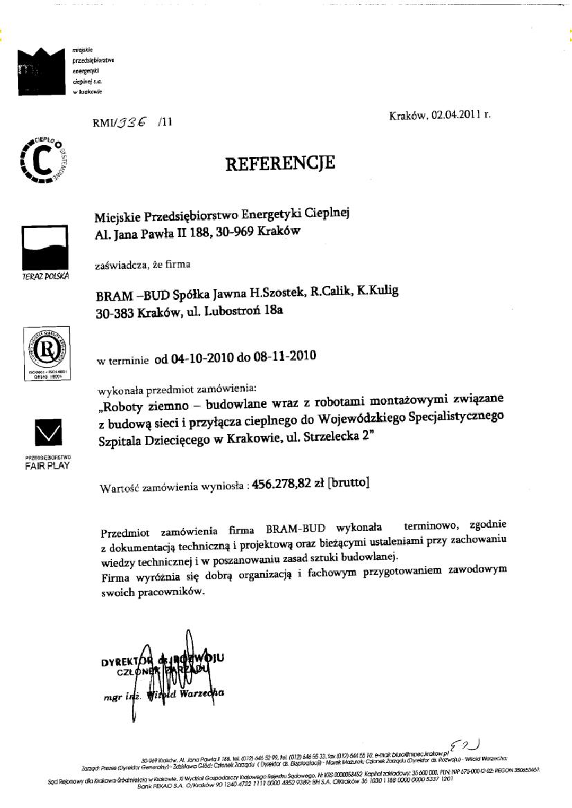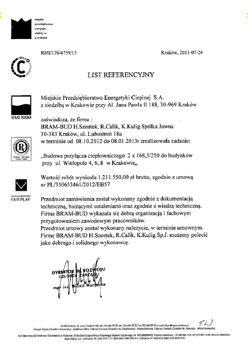 - 2013.07.24 Miejskie Przedsiębiorstwo Energetyki Cieplnej S.A. z siedzibą w Krakowie przy Al. Jana Pawła II2013.12.12 Szpital Miejski Specjalistyczny im. Gabriela Narutowicza w Krakowie