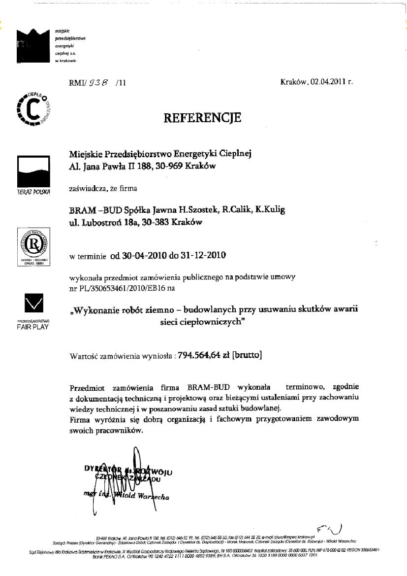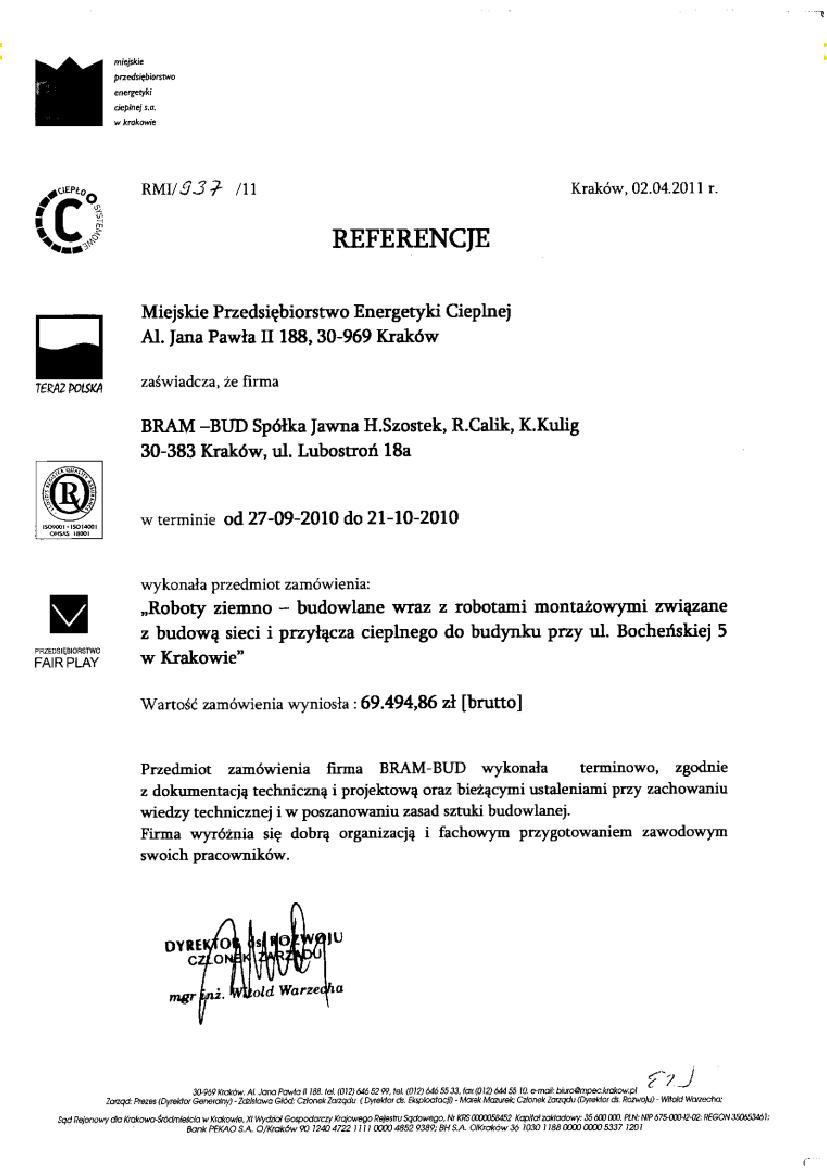 - 2011.04.02 Miejskie Przedsiębiorstwo Energetyki Cieplnej S.A. z siedzibą w Krakowie przy Al. Jana Pawła II